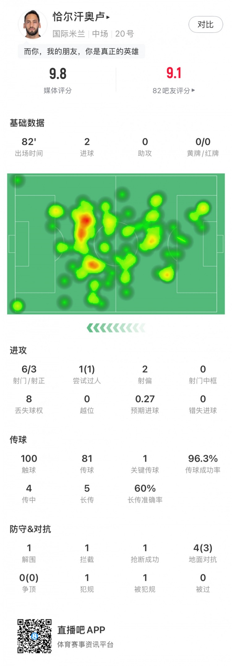 9月14日訊 國米客戰尤文的意甲第3輪比賽正在進(jìn)行,此役恰爾汗奧盧代表國米首發(fā)出戰,在第82分鐘被換下,球員本場(chǎng)數據如下: