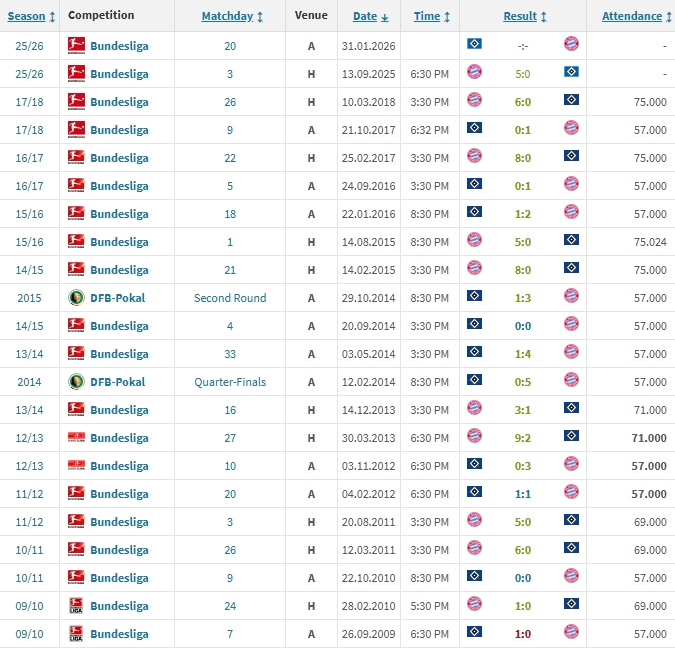漢堡時(shí)隔7年再次對陣拜仁,結果5球慘敗。漢堡各賽事對拜仁已9連敗、20場(chǎng)不勝,且包含多場(chǎng)慘敗,兩次0-8、1次2-9、4次0-5、2次0-6,總比分7-76。