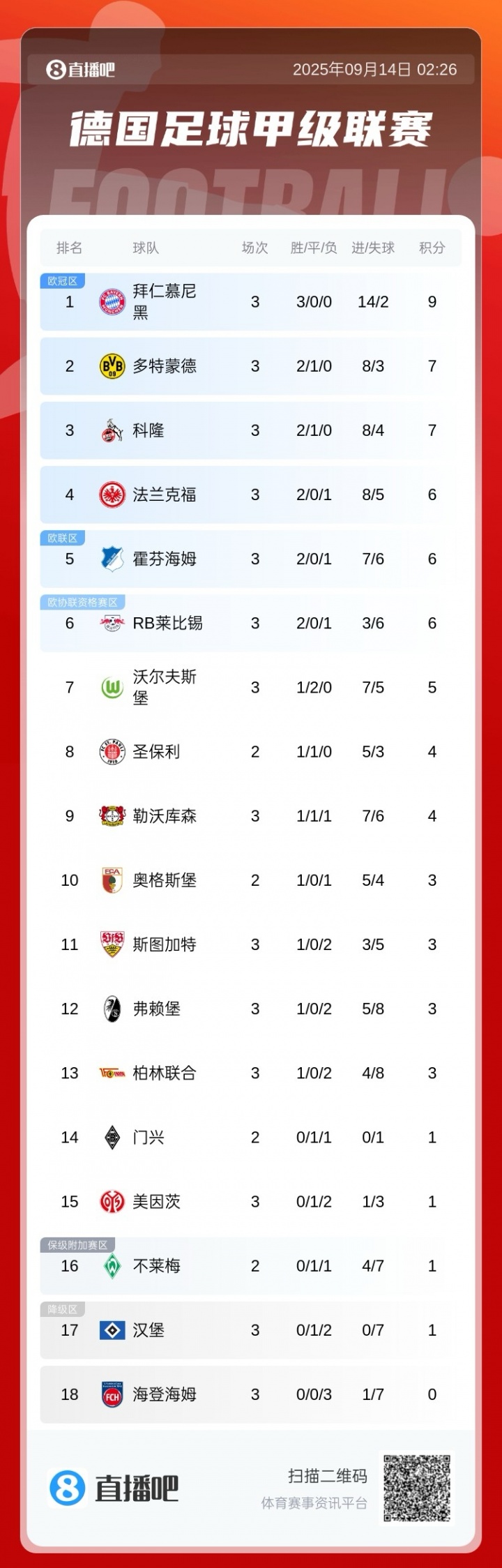 德甲積分榜:拜仁三連勝領(lǐng)跑,漢堡3場(chǎng)不勝0進(jìn)球暫排倒二