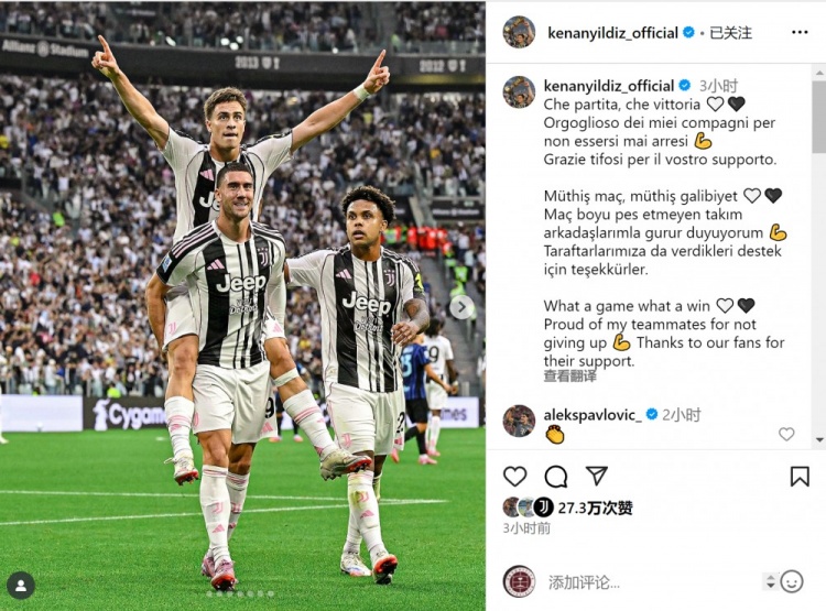 伊爾迪茲社媒曬出弗拉霍維奇背起他慶祝進(jìn)球的照片,配文:“多么精彩的比賽,多么美妙的勝利!為我的隊友們沒(méi)有放棄感到驕傲,感謝球迷們的支持!”