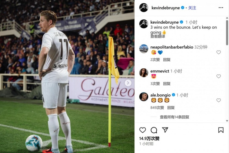 9月14日訊 北京時(shí)間今天凌晨,本賽季意甲第3輪,那不勒斯客場(chǎng)3-1擊敗佛羅倫薩,德布勞內點(diǎn)射為那不勒斯首開(kāi)紀錄,他賽后更新社媒慶賀勝利。