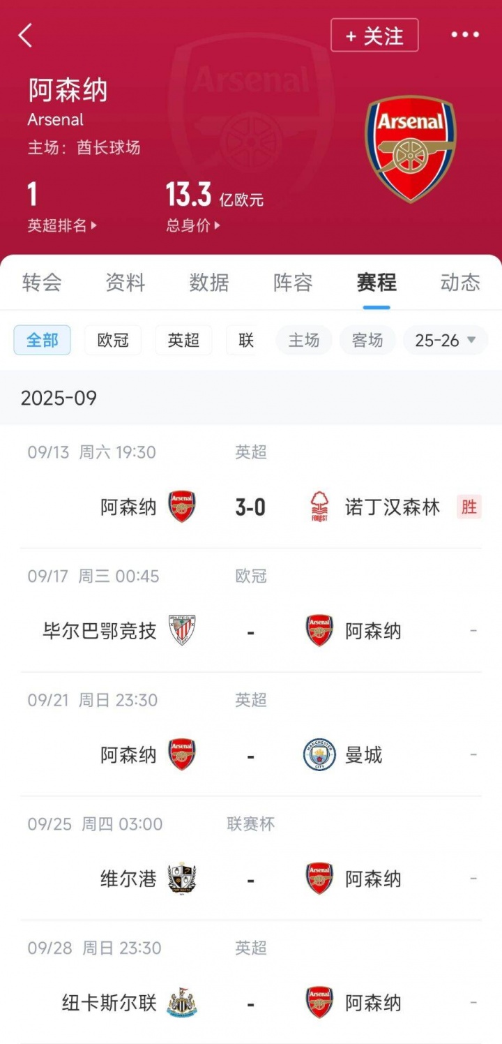 09月14日訊 英超第4輪阿森納3-0擊敗諾丁漢森林,取得9月開(kāi)門(mén)紅。