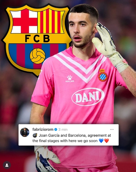 06月03日訊 據知名記者羅馬諾消息,西班牙人門(mén)將霍安-加西亞即將加盟巴薩,Here we go馬上到來(lái)。