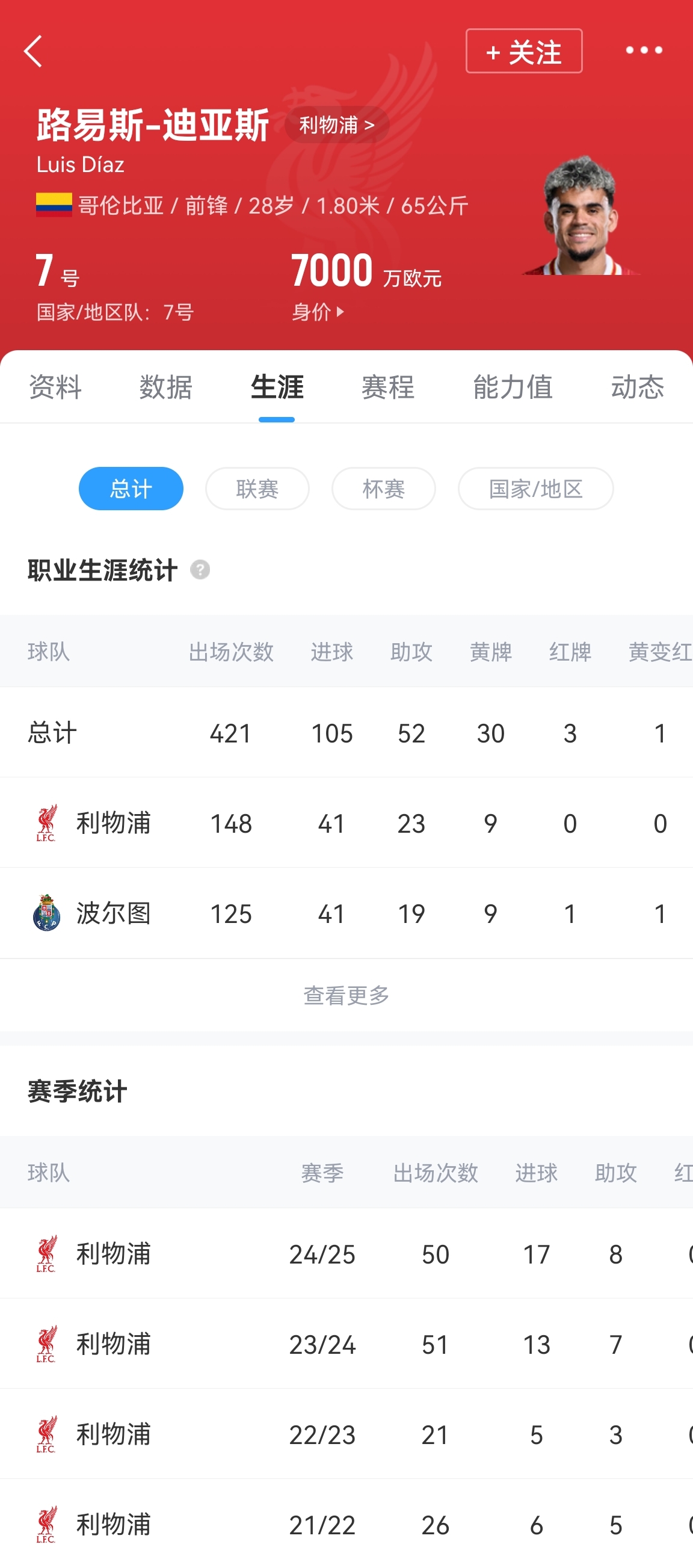 迪亞斯2022年冬窗5400萬(wàn)歐元從波爾圖轉會(huì )利物浦,目前共為利物浦出場(chǎng)148次,打入41球23助攻,他的身價(jià)從加盟前的4000萬(wàn)歐元漲至目前的7000萬(wàn)歐元。