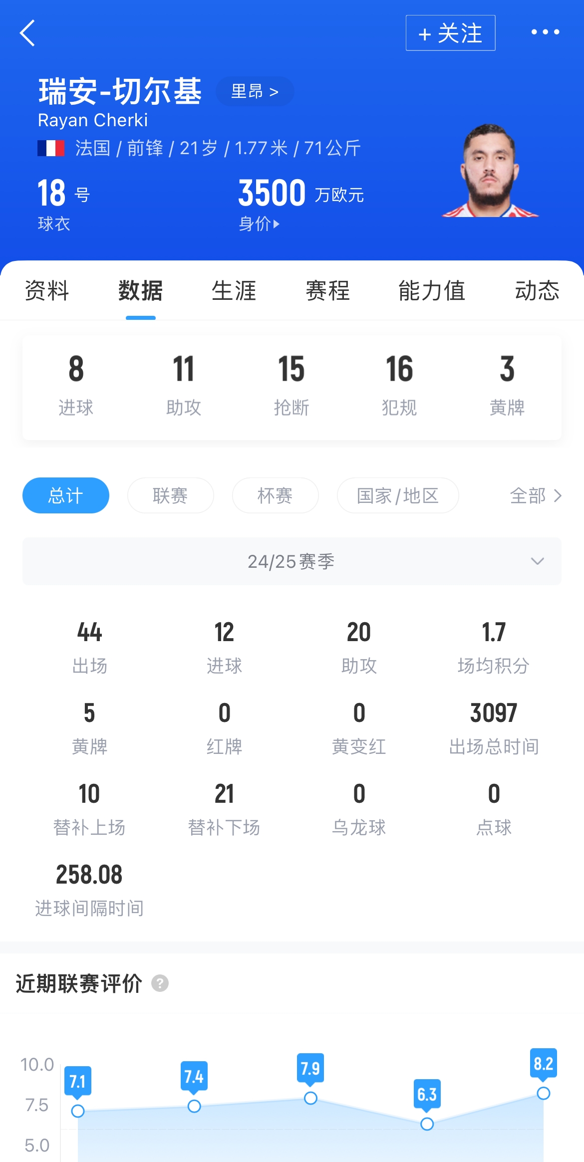 本賽季切爾基為里昂各項賽事累計出場(chǎng)44場(chǎng),取得了12粒進(jìn)球以及20次助攻,目前其德轉身價(jià)為3500萬(wàn)歐元。