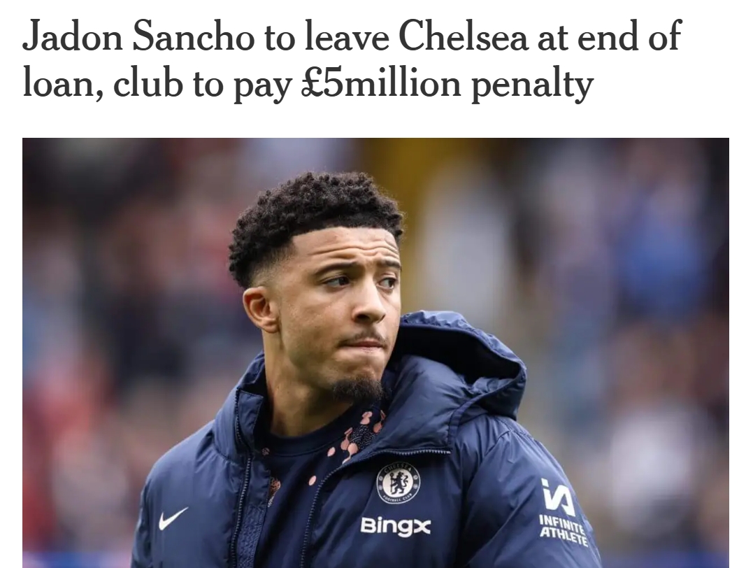 25歲桑喬租借合同中有2500萬(wàn)鎊的買(mǎi)斷條款,由于切爾西不會(huì )觸發(fā)該條款,藍軍將向曼聯(lián)支付500萬(wàn)鎊違約金。桑喬將在今夏另謀下家。