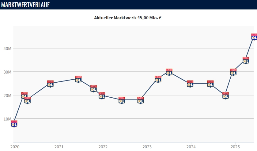 06月03日訊 今日德轉更新法甲球員身價(jià),21歲的里昂球員切爾基身價(jià)暴漲1千萬(wàn),目前4500萬(wàn)也是球員生涯身價(jià)新高。