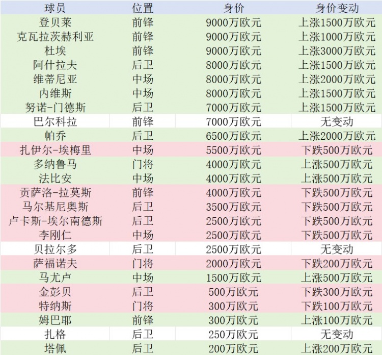 巴黎球員身價(jià)更新↓