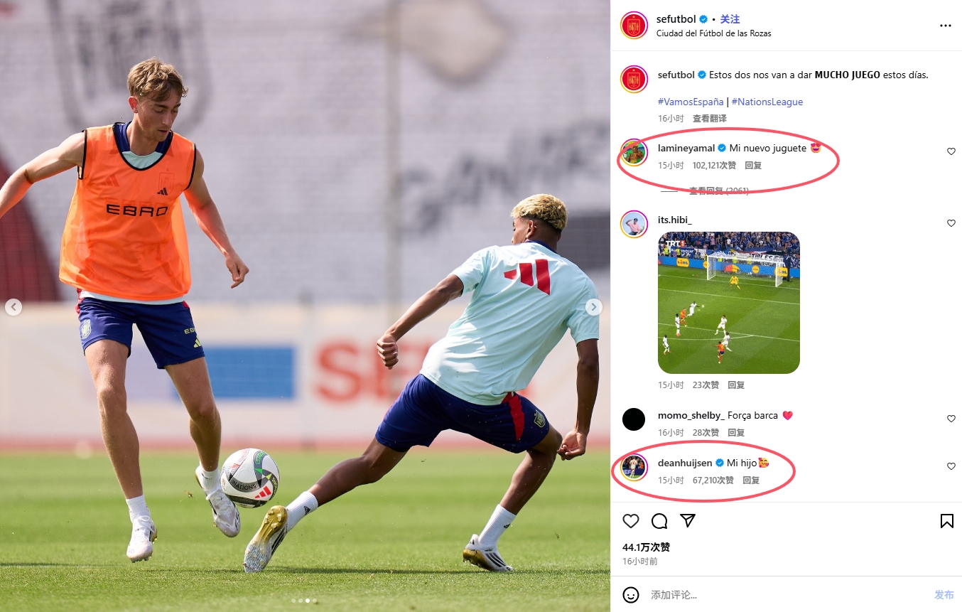 西班牙國家隊社媒曬出亞馬爾和懷森的訓練照,評論區兩人互相調侃。