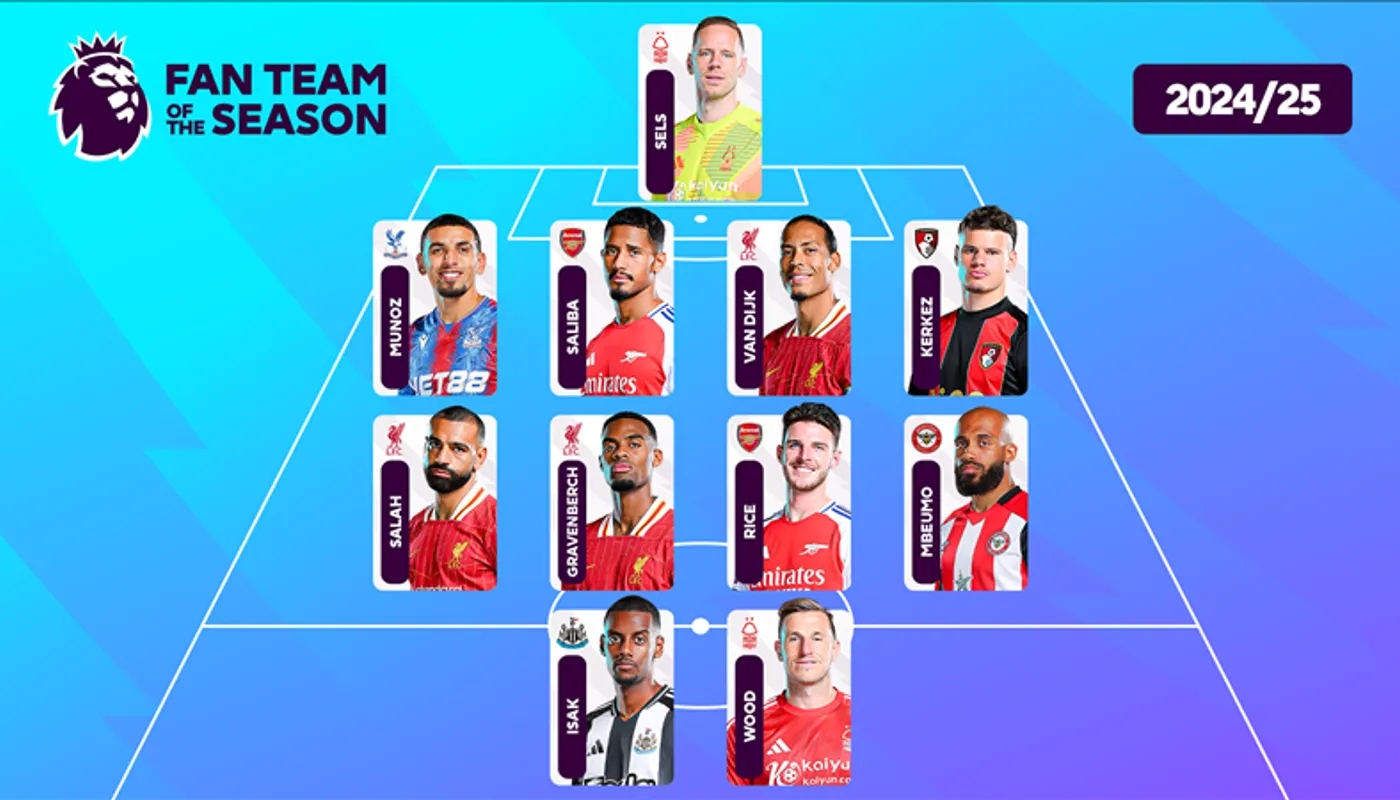 05月30日訊 英超官方公布了球迷票選的2024/25賽季最佳陣容,冠軍利物浦3人入選,阿森納和森林各2人入選,水晶宮、伯恩茅斯、布倫特福德和紐卡各1人入選。