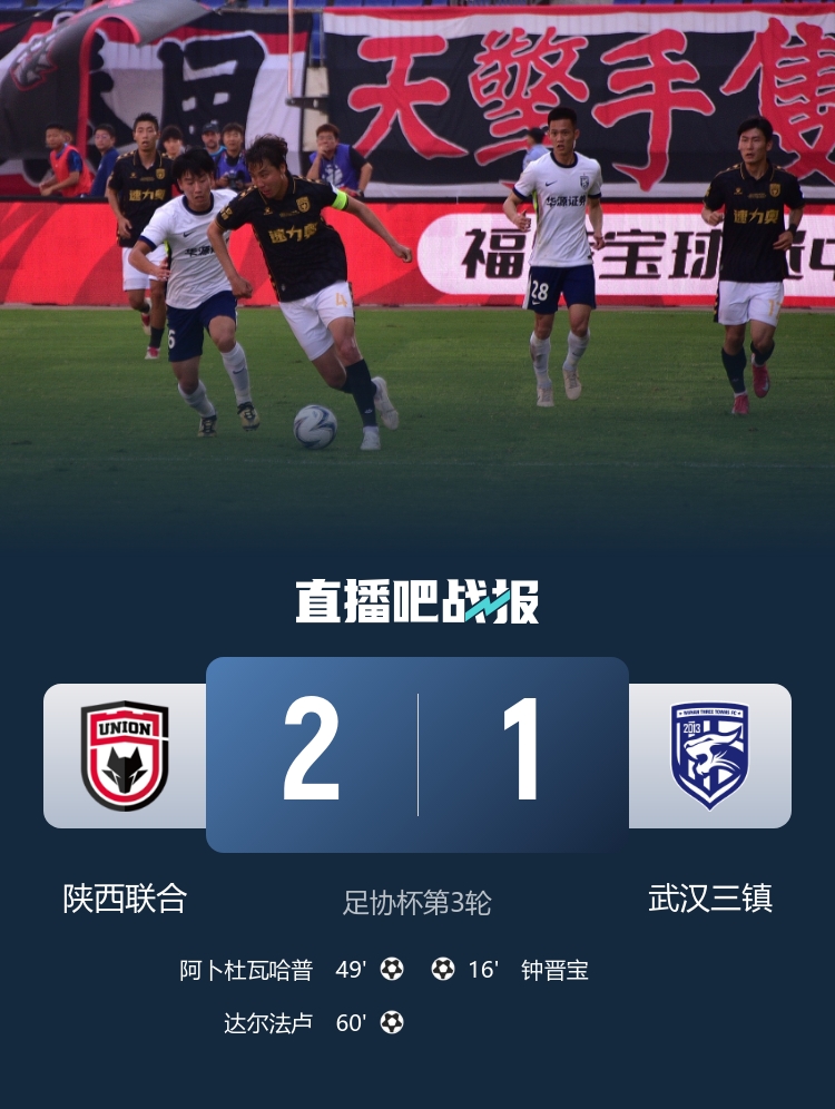 全場(chǎng)比賽結束,陜西聯(lián)合2-1逆轉武漢三鎮。