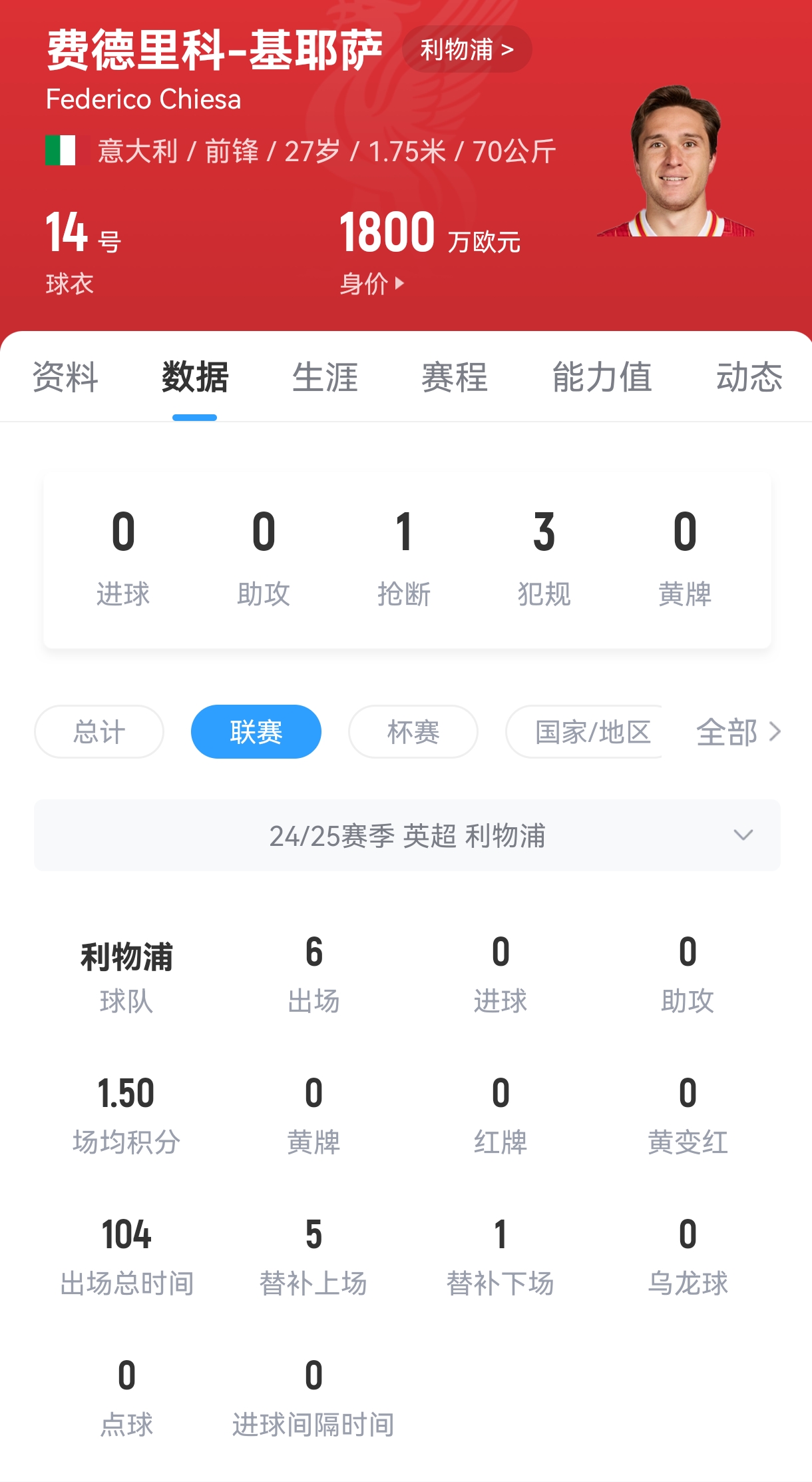 基耶薩在去年以1200萬(wàn)歐的價(jià)格從尤文加盟利物浦,他出場(chǎng)14次貢獻2球2助。