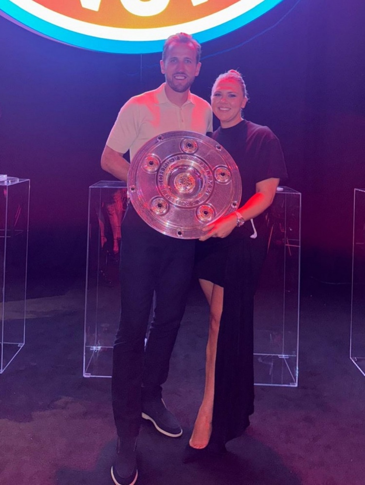 凱蒂社媒曬出手捧德甲冠軍獎盤(pán)與凱恩的合照,配文:“德甲冠軍?!?/p>