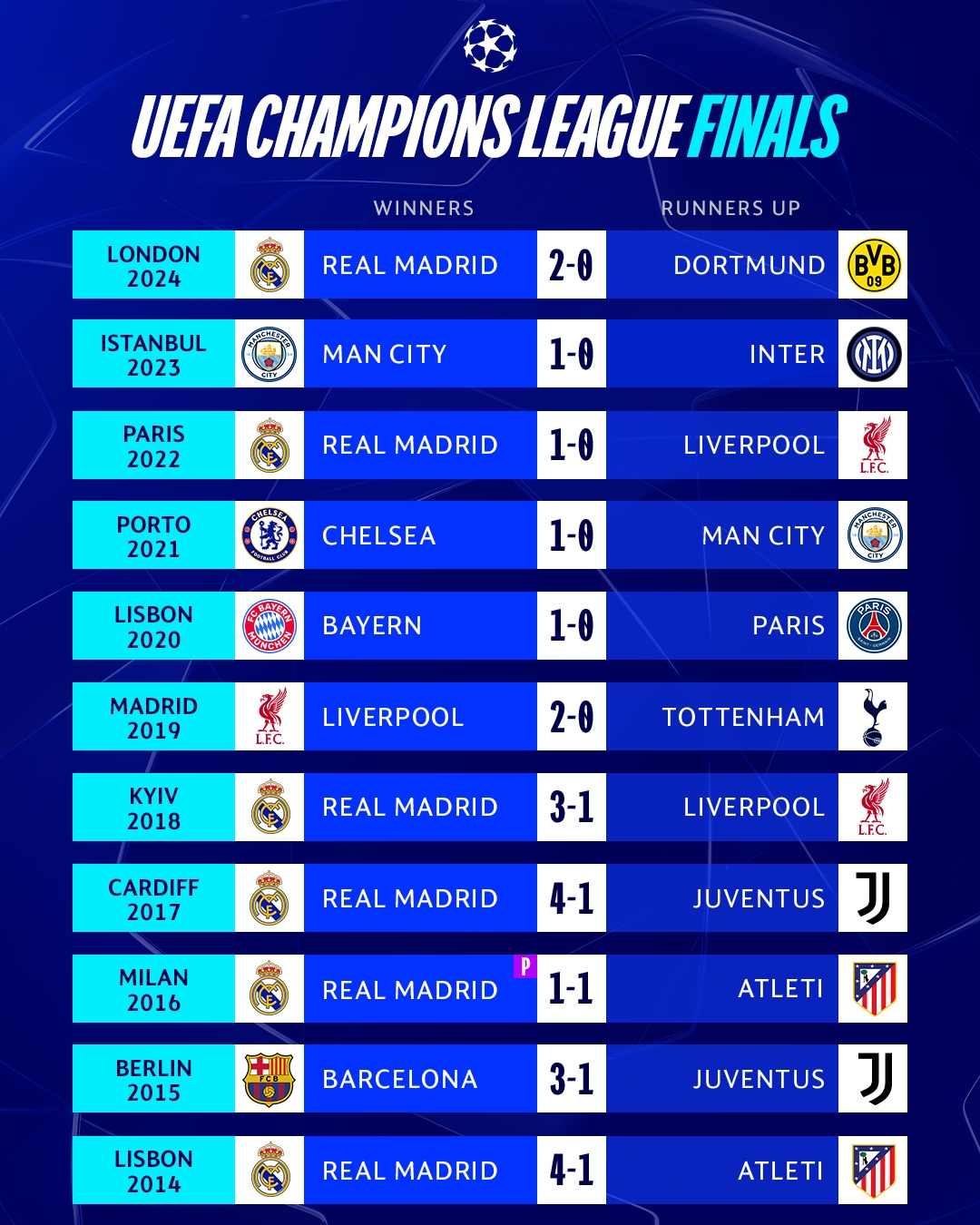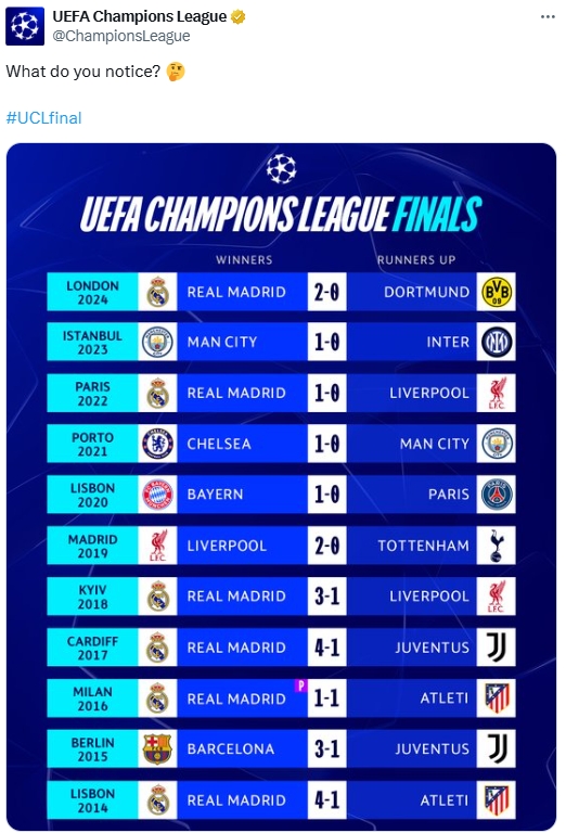 歐冠官方曬出近11年的決賽比分,提問(wèn):你注意到了什么?
