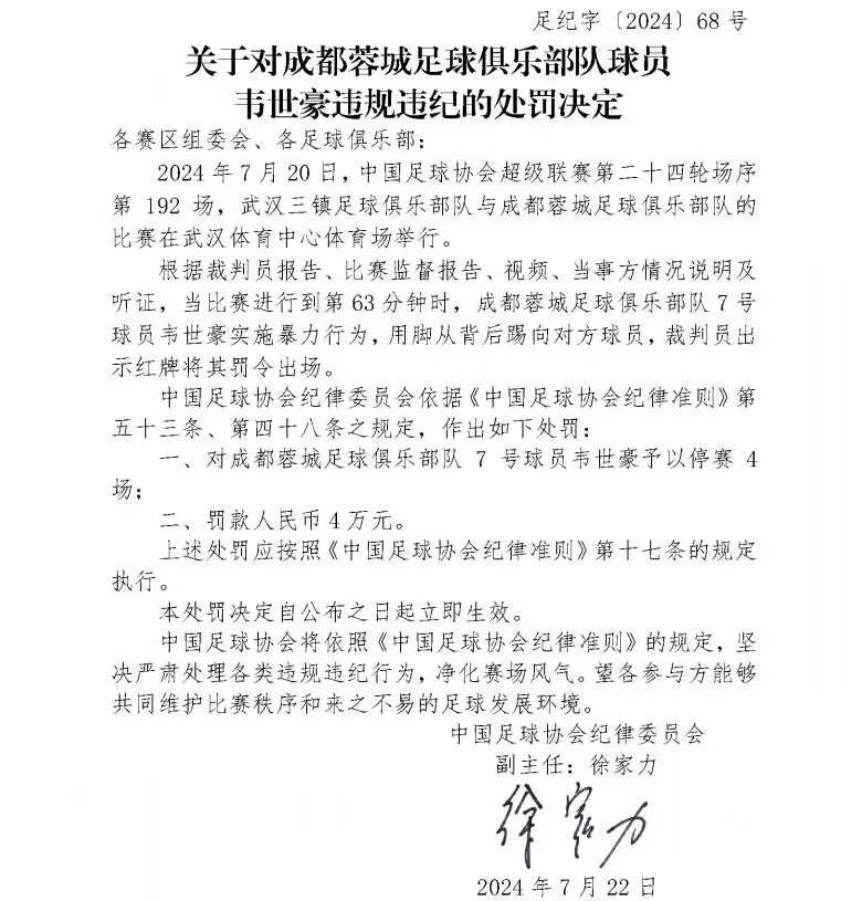 去年7月中超第24輪武漢三鎮vs成都蓉城。比賽第63分鐘,蓉城前鋒韋世豪背后踹翻老隊友鄧涵文,被主裁判出示紅牌直接罰下。