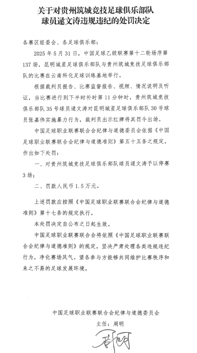 06月04日訊 中足聯(lián)官方公布了對于貴州筑城競技足球俱樂(lè )部隊助理教練陳隆、球員逯文濤、球員張家欣的違規違紀的處罰決定。