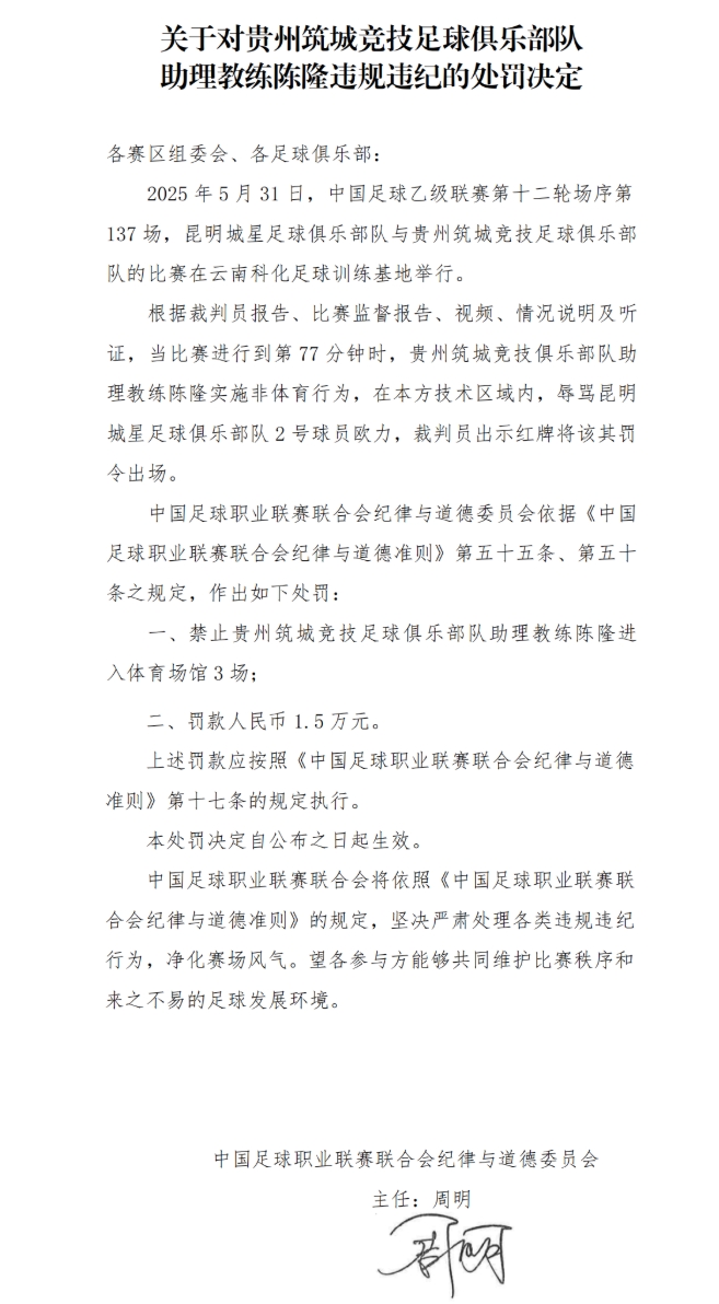 助理教練陳?。簩?shí)施非體育行為,停賽3場(chǎng)罰款1.5萬(wàn)。