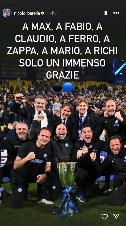 6月5日訊 國米主帥小因扎吉離任,巴雷拉更新社媒動(dòng)態(tài),對他及其教練團隊表示感謝。