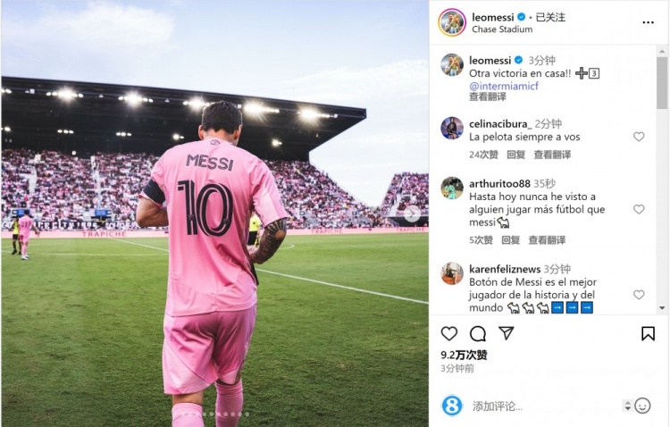 梅西在社交媒體上曬出身穿邁阿密?chē)H球衣的背影照片,并配文:“又一場(chǎng)主場(chǎng)勝利!?3??”
