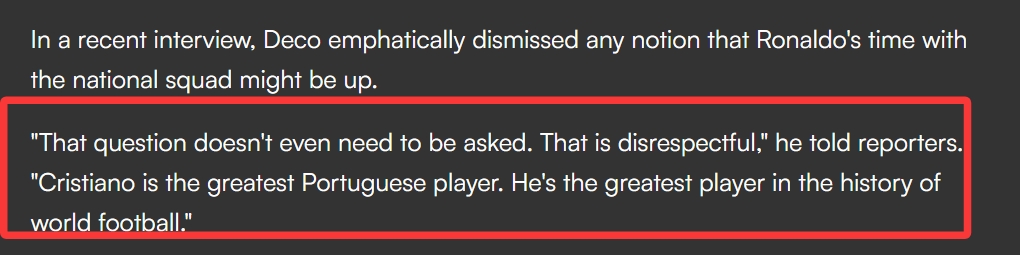 德科說(shuō):“這根本就是一個(gè)不需要問(wèn)的問(wèn)題,而且是缺乏尊重的??死锼沟賮喼Z是葡萄牙最偉大的球員,他也是世界足球歷史上最偉大的球員?!?/p>