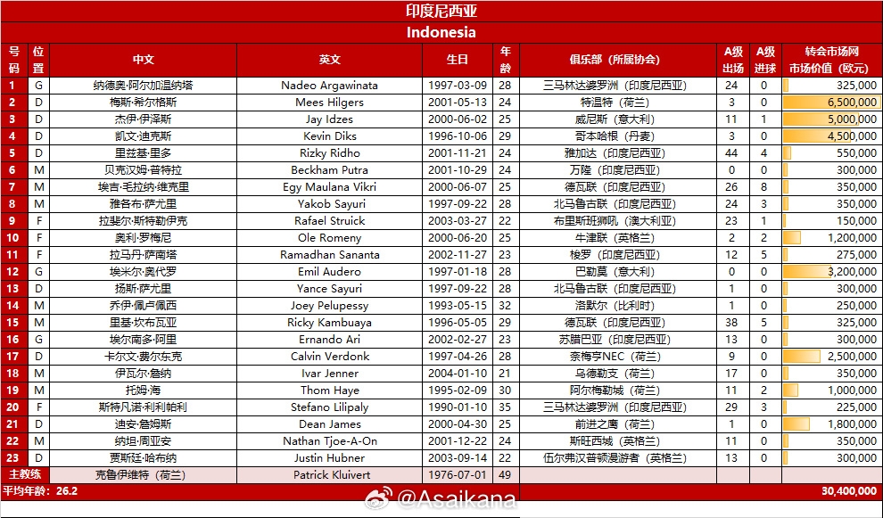 印尼隊23人名單平均年齡26.2歲,總身價(jià)3040萬(wàn)歐元,身價(jià)最高的球員是希爾格斯,達到650萬(wàn)歐元,隊內共有8位球員身價(jià)超過(guò)100萬(wàn)歐。