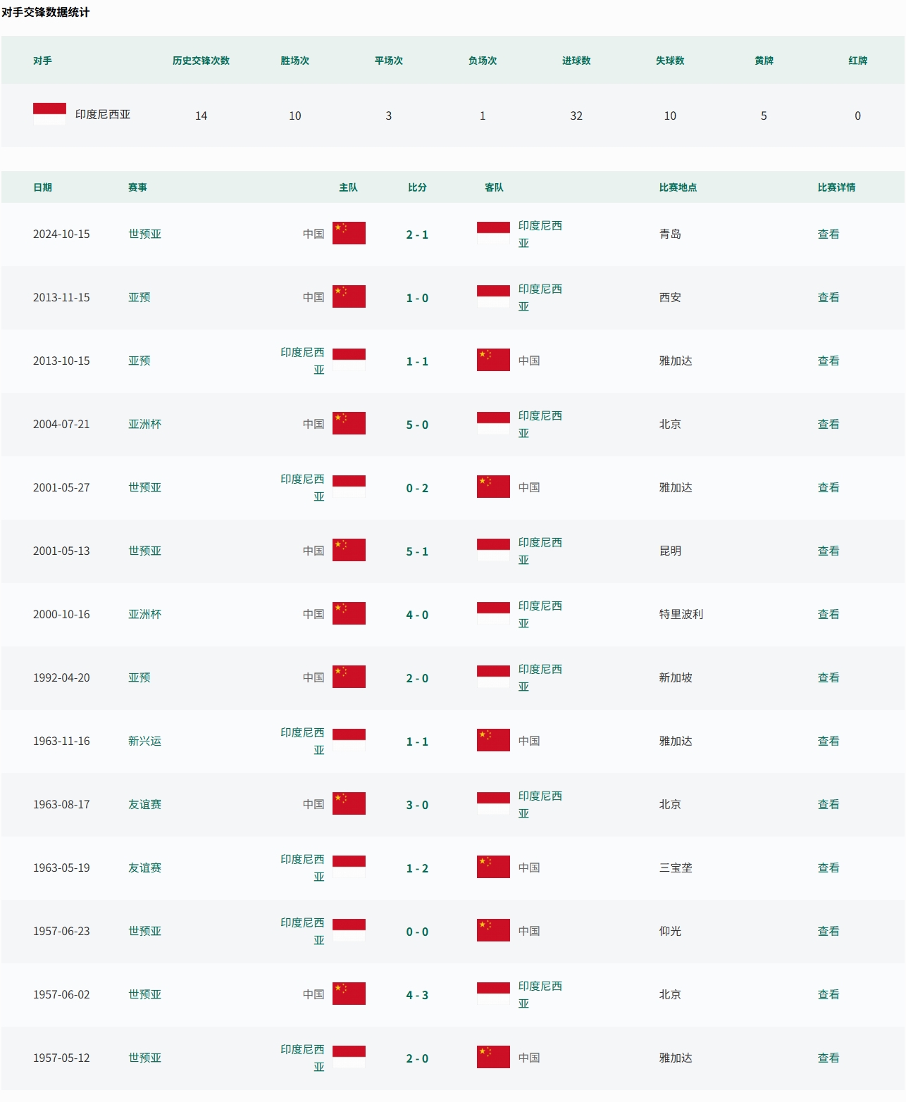 注:有說(shuō)法稱(chēng)國足上一次負于印尼是在1987年的泰國國王杯上1-3告負,經(jīng)查證,當時(shí)中方派出的是湖北省代表隊,印尼則是派出名為Galatama XI的選拔隊,均非正選國家隊。且該賽事所有比賽均未計為國際足聯(lián)A級賽事。