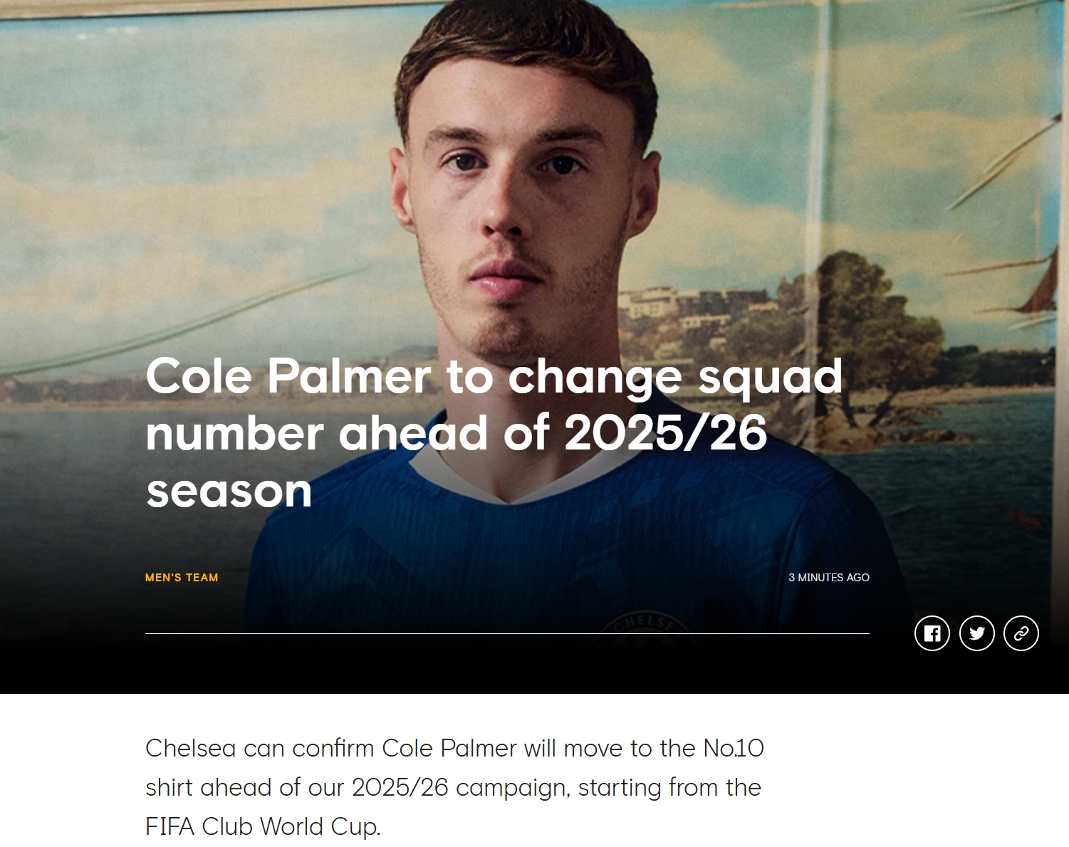 06月05日訊 切爾西官方發(fā)布公告,宣布帕爾默將在2025/26賽季改穿10號球衣,帕爾默將從世俱杯開(kāi)始身披10號球衣。