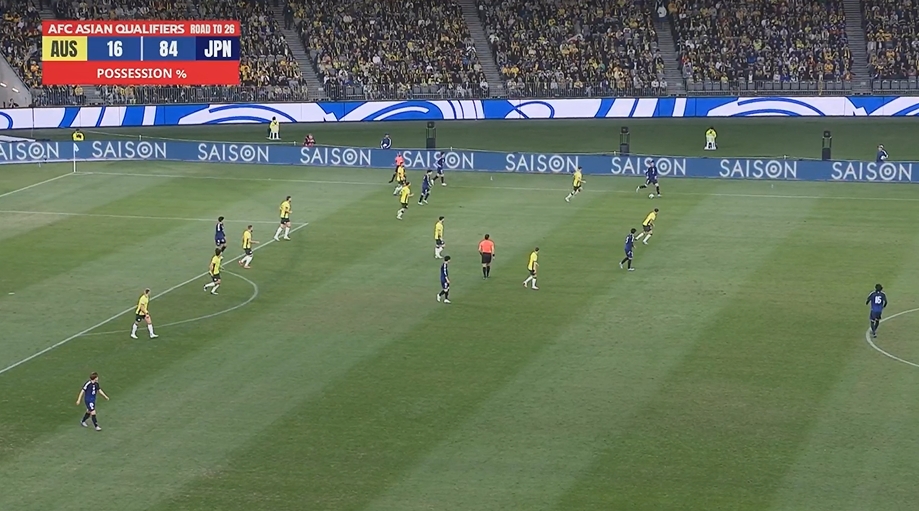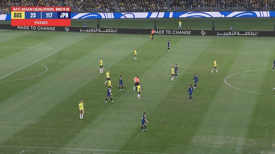 比賽開(kāi)場(chǎng)10分鐘,日本控球率高達84%,共2腳射門(mén)0射正,完成了117腳傳球,傳球成功率高達91% ;澳大利亞僅25腳傳球,傳球成功率56%,沒(méi)有完成射門(mén)。