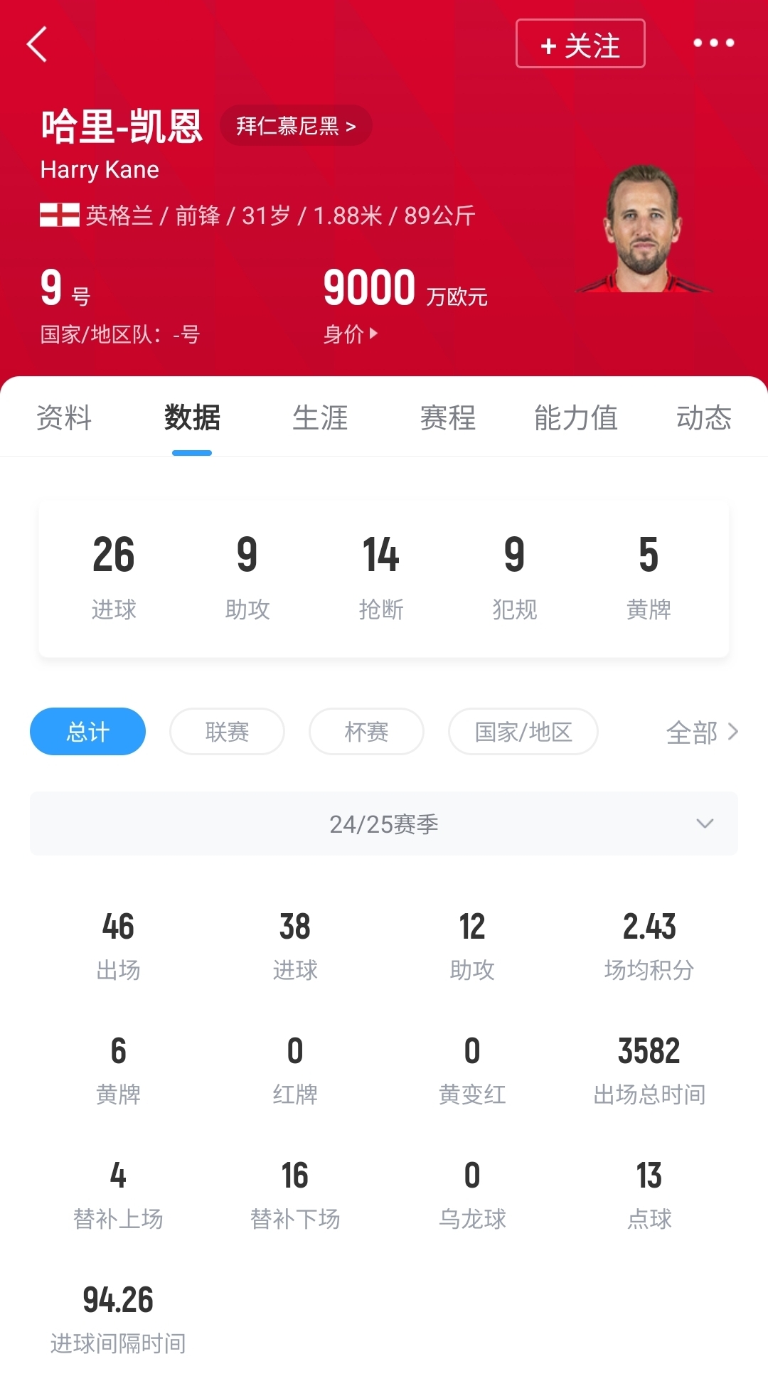 本賽季31歲的凱恩出戰46場(chǎng)比賽,貢獻38球12助,幫助拜仁拿下德甲冠軍,這也是凱恩生涯第一個(gè)重要獎杯。