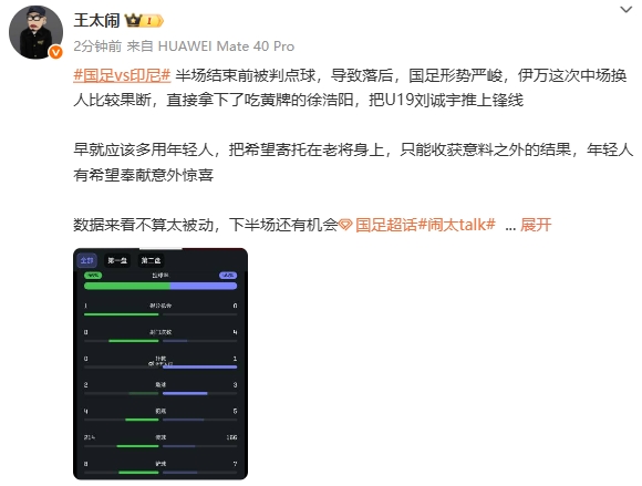 06月05日訊 今日,國足迎世預賽生死戰,客場(chǎng)對陣印尼,目前國足0-1落后。媒體人“王太鬧”在社媒評國足半場(chǎng)換人。