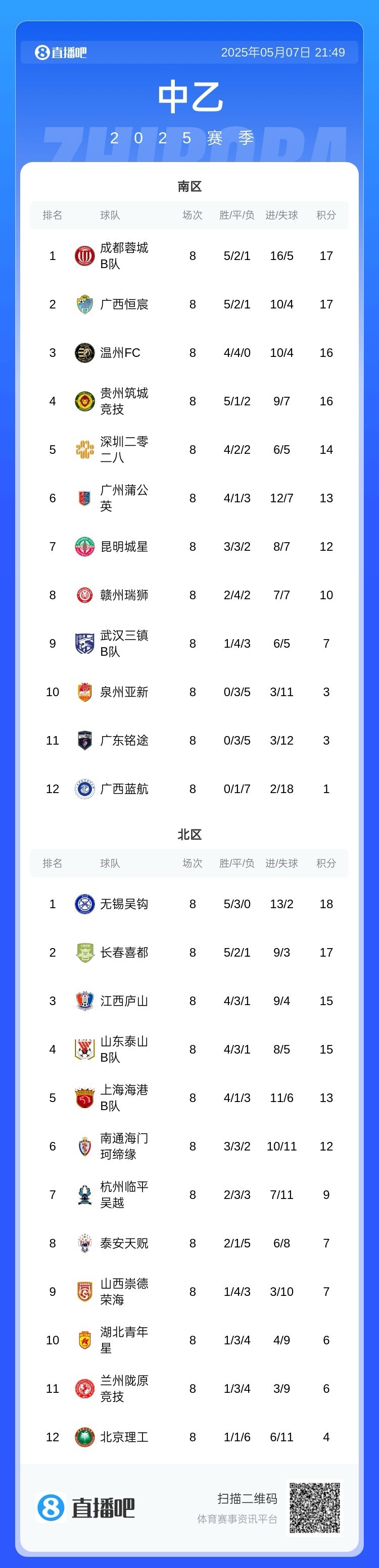 5月7日訊 中乙第8輪結束爭奪,蓉城B隊4-0大勝廣西藍航領(lǐng)跑南區,泰山B隊收獲兩連勝升至北區第四。