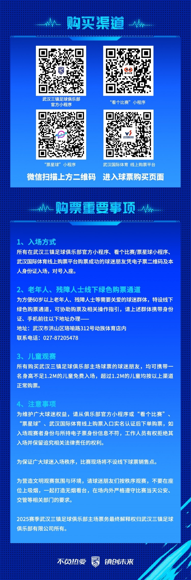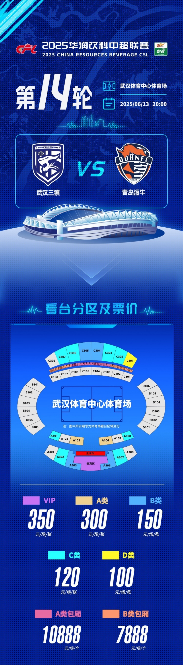 6月13日,2025中超聯(lián)賽第14輪,武漢三鎮將坐鎮主場(chǎng)迎戰青島海牛。本場(chǎng)比賽球票將于今日(6月6日)18:00開(kāi)啟發(fā)售,歡迎各位球迷朋友進(jìn)行購買(mǎi)。短暫間歇結束,共啟仲夏序章,讓我們繼續相約武漢體育中心,并肩為武漢而戰!