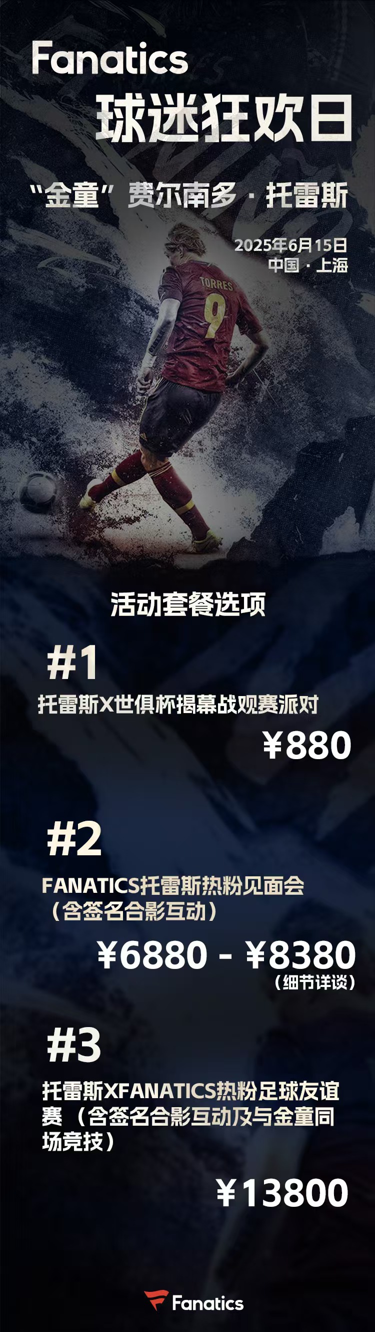 送托雷斯親簽!歡迎@Fanatics熱粉為此次托雷斯中國行帶來(lái)球迷狂歡日粉絲體驗。西班牙金童中國行6月15日活動(dòng)詳細安排來(lái)啦!托雷斯陪你看世俱杯、與托雷斯同場(chǎng)競技,詳細信息如圖。
