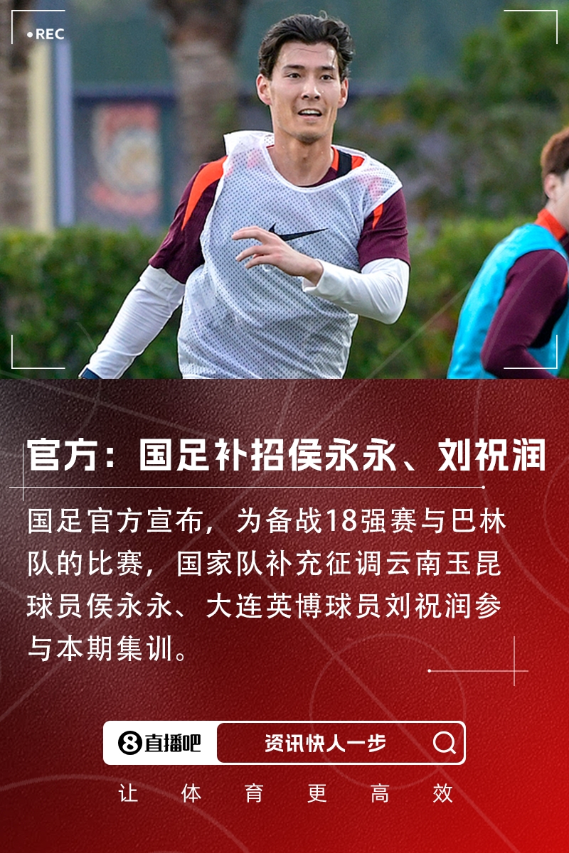 為備戰參加2026國際足聯(lián)美加墨世界杯預選賽亞洲區18強賽與巴林隊的比賽,經(jīng)國家男子足球隊教練組研究、中國足球協(xié)會(huì )批準,國家隊補充征調云南玉昆足球俱樂(lè )部球員侯永永、大連英博足球俱樂(lè )部球員劉祝潤參與本期集訓。