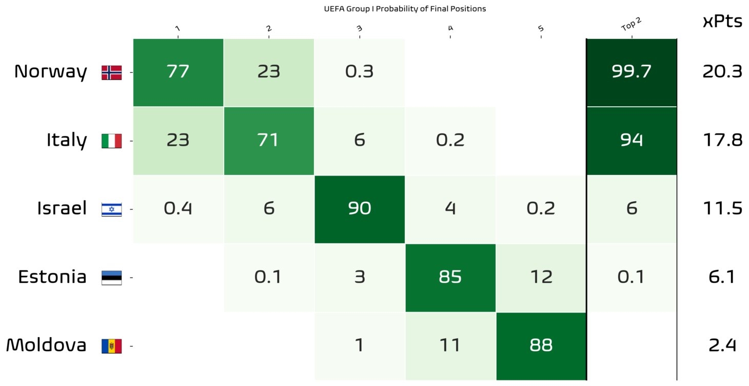 目前挪威3戰全勝領(lǐng)跑歐洲I組,小組第一直通的概率為77%,小組前二的概率為99.7%,晉級世界杯的綜合概率為84.1%。