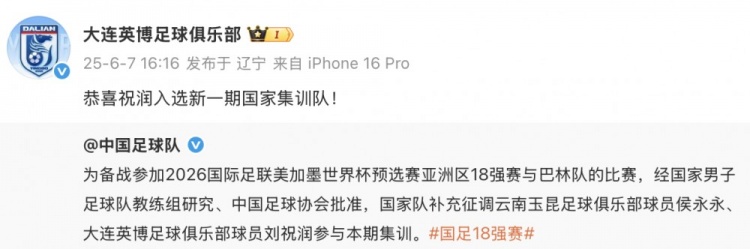 6月7日訊 在劉祝潤補招進(jìn)入國足后,大連英博俱樂(lè )部向他送上了祝賀。