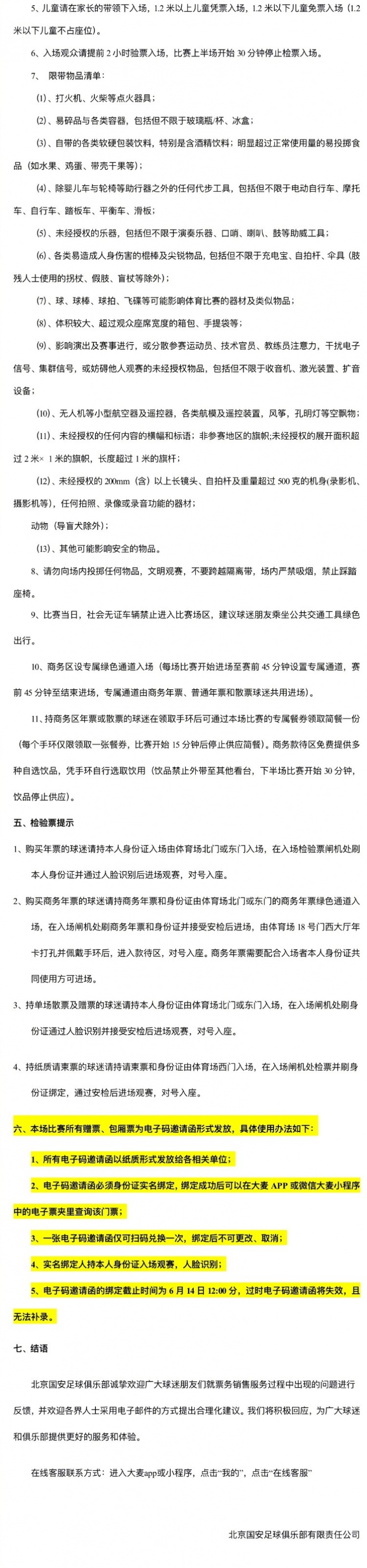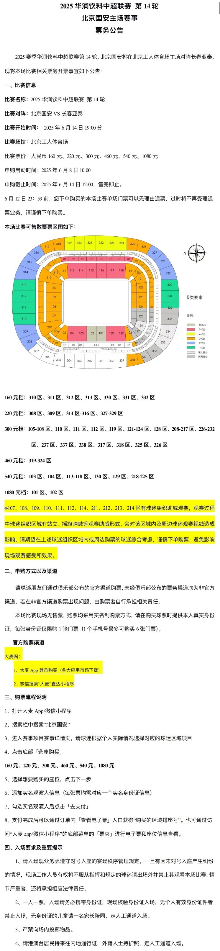 2025賽季華潤飲料中國足球協(xié)會(huì )超級聯(lián)賽第14輪,北京國安將在北京工人體育場(chǎng)主場(chǎng)對陣長(cháng)春亞泰,現將本場(chǎng)比賽相關(guān)票務(wù)開(kāi)票事宜如下公告,請各位球迷詳細閱讀圖中的公告內容。
