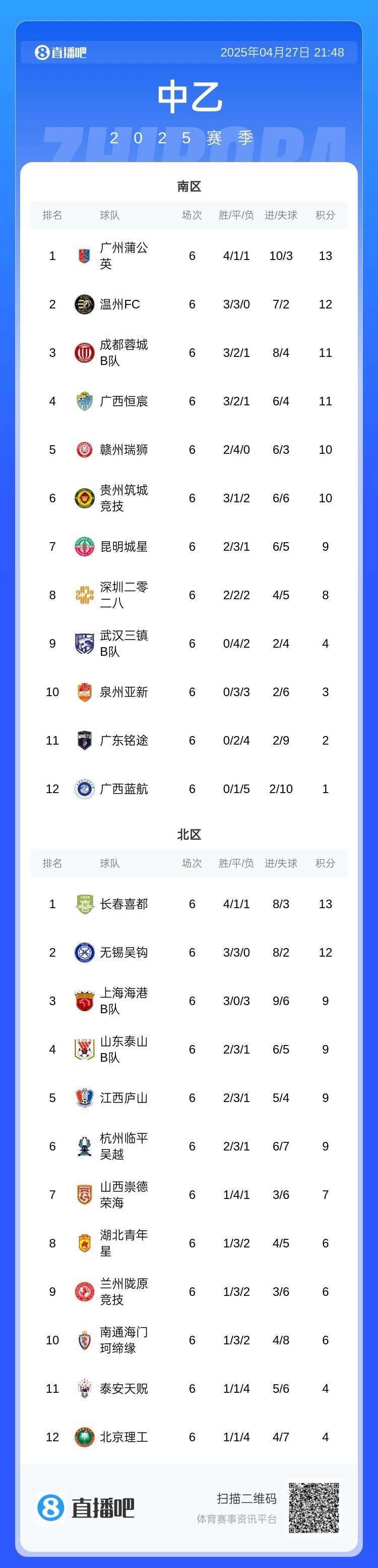 4月27日訊 中乙第6輪結束爭奪,泰山B隊0-2不敵長(cháng)春喜都,海港B隊、蓉城B隊取勝。積分榜方面,廣州蒲公英領(lǐng)跑南區,長(cháng)春喜都領(lǐng)跑北區。