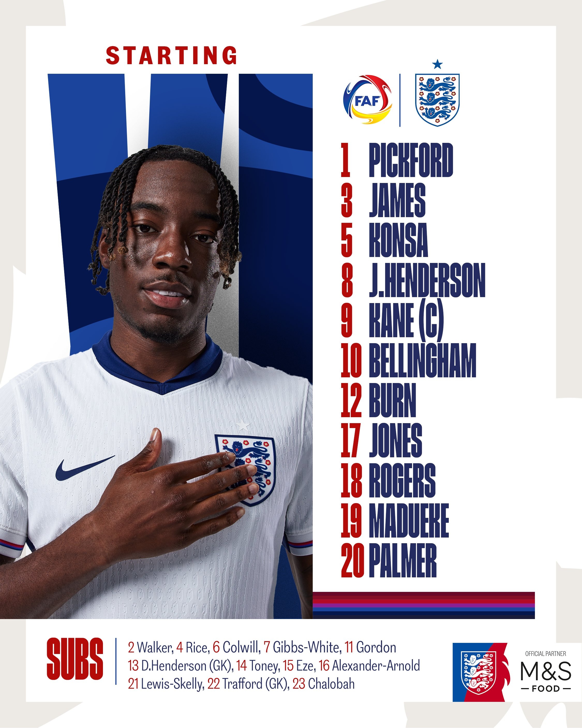 英格蘭首發(fā):1-皮克福德、3-里斯-詹姆斯、5-孔薩、12-丹-伯恩、17-柯蒂斯-瓊斯、8-亨德森、10-貝林厄姆、20-帕爾默、9-凱恩、18-摩根-羅杰斯、19-馬杜埃凱