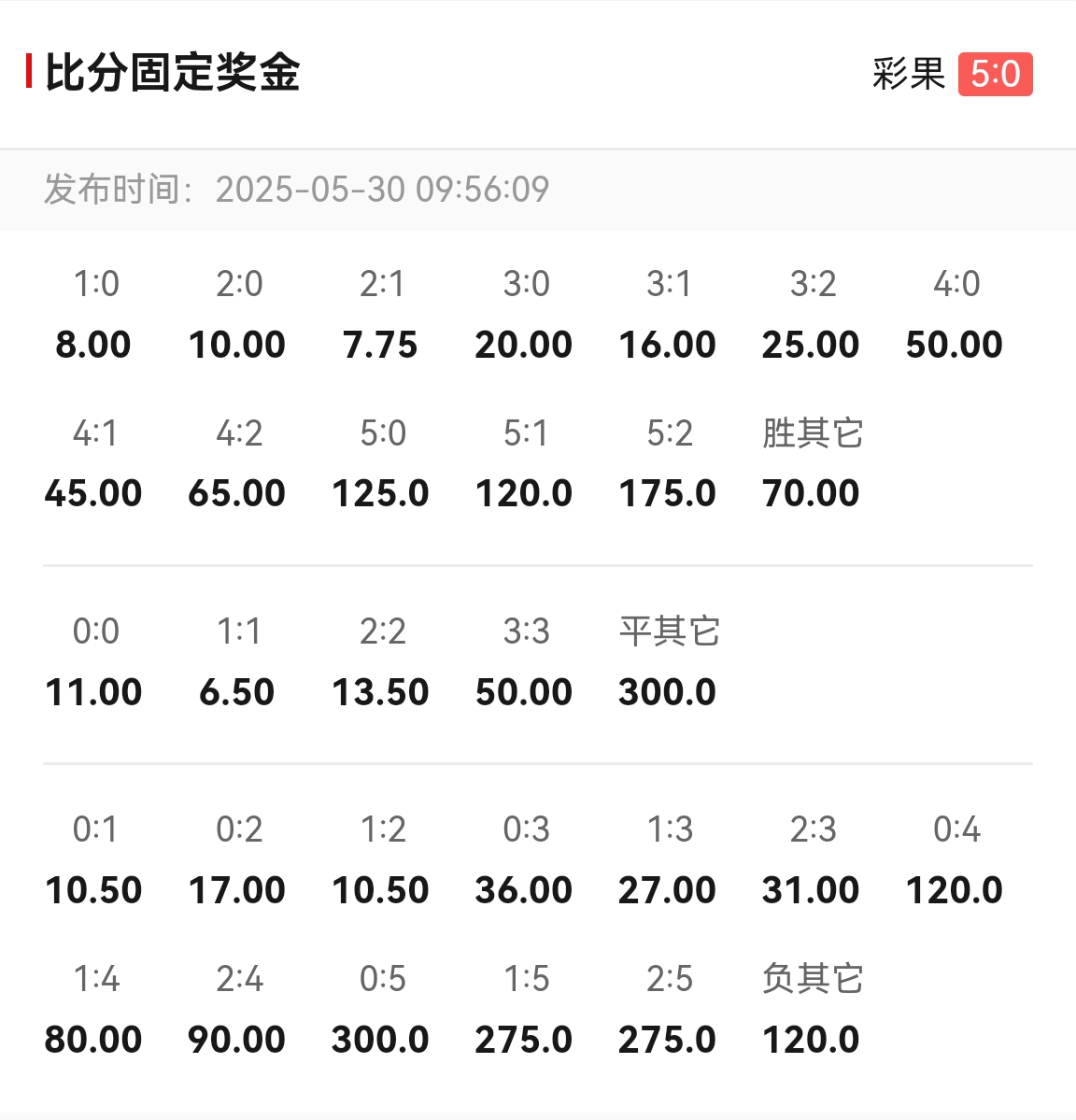 06月01日訊 歐冠決賽巴黎5-0橫掃國米,在賽前的中國體育彩票“猜比分”玩法中,巴黎5-0國米的比分固定獎金高達125倍!