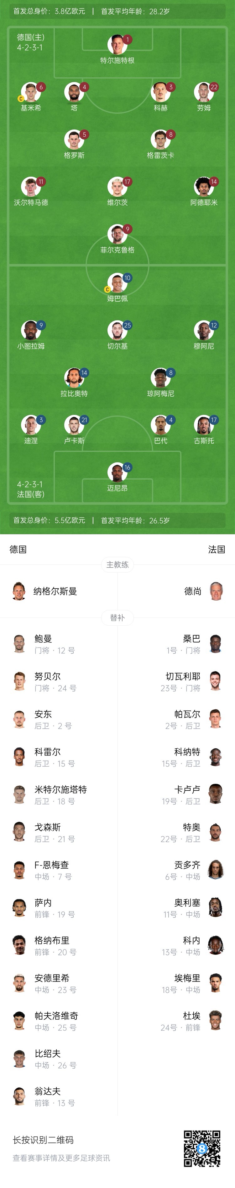 06月08日訊 北京時(shí)間21:00,歐國聯(lián)A聯(lián)賽季軍戰,德國對陣法國,賽前雙方首發(fā)陣容出爐!