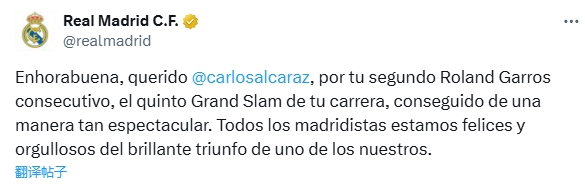 皇馬祝賀阿爾卡拉斯奪法網(wǎng):“親愛(ài)的阿爾卡拉斯,恭喜你連續第二次贏(yíng)得羅蘭-加洛斯冠軍,以如此精彩的方式獲得你職業(yè)生涯的第五個(gè)大滿(mǎn)貫冠軍。我們所有皇馬人都為你的輝煌勝利感到高興和自豪?!?/p>