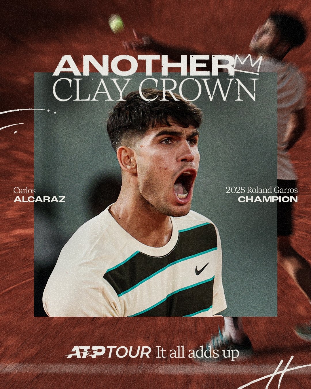 06月09日訊 2025法網(wǎng)男單決賽,阿爾卡拉斯鏖戰5小時(shí)29分,3-2逆轉戰勝辛納奪冠?;蜀R發(fā)文祝賀。