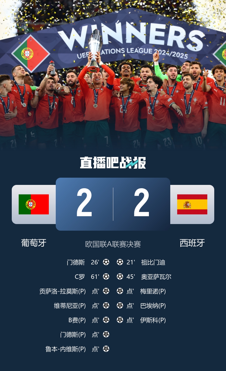 6月9日訊 北京時(shí)間6月9日凌晨3:00,歐國聯(lián)A聯(lián)賽決賽,葡萄牙對陣西班牙。上半場(chǎng)葡萄牙防線(xiàn)解圍失誤,祖比門(mén)迪破門(mén),努諾-門(mén)德斯扳平,奧亞薩瓦爾進(jìn)球再度將比分超出,葡萄牙暫1-2西班牙;下半場(chǎng)B費破門(mén),但這球內托觸球時(shí)越位在先無(wú)效,C羅扳平,隨后在比賽尾聲階段傷退,常規時(shí)間葡萄牙2-2西班牙,比賽進(jìn)入加時(shí);加時(shí)賽兩隊均無(wú)建樹(shù),仍2-2戰平;點(diǎn)球大戰,葡萄牙5人均罰中,西班牙莫拉塔失點(diǎn),最終葡萄牙點(diǎn)球大戰5-3西班牙,第二次贏(yíng)得歐國聯(lián)冠軍。