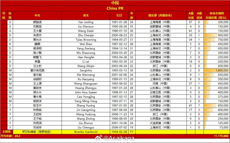 中國、巴林國家隊本比賽日集訓大名單年齡、身價(jià)對比