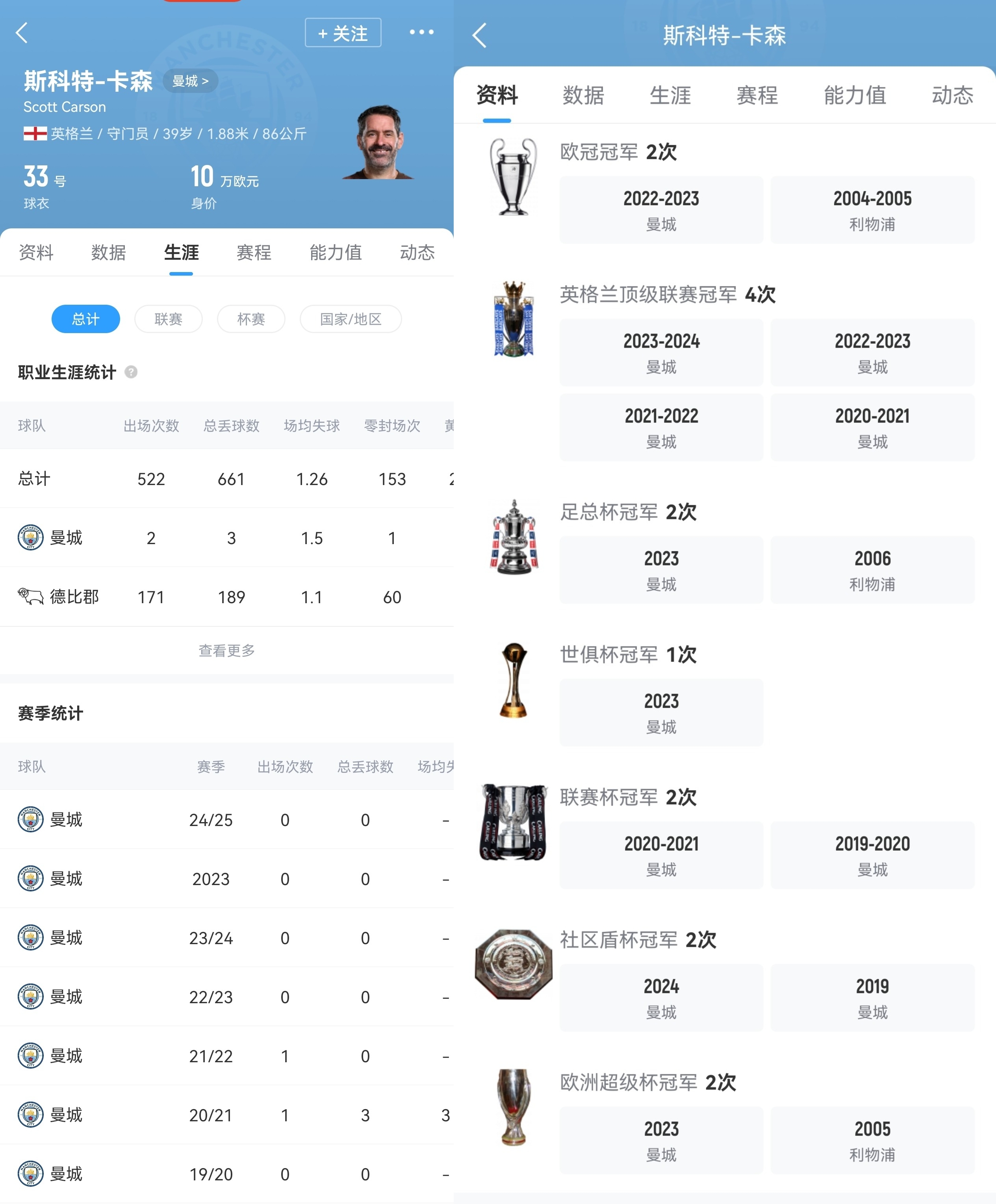 06月09日訊 曼城官方宣布,39歲的老門(mén)將卡森合同到期離隊??ㄉ?019年加盟曼城,6年時(shí)光只出場(chǎng)2次,但隨隊奪得12座各項賽事的冠軍。