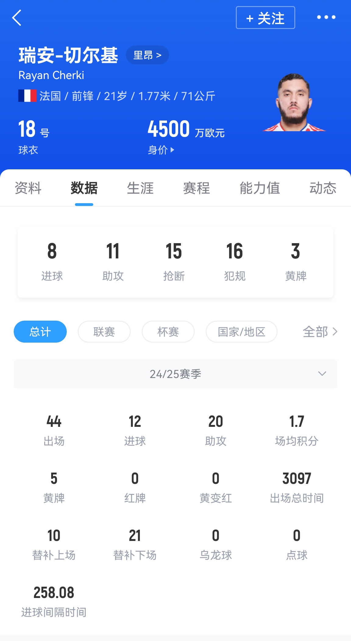 切爾基是里昂青訓出身,2024/25賽季為里昂出場(chǎng)44次,打入12球20助攻。切爾基目前身價(jià)4500萬(wàn)歐元,他與里昂的合同還剩最后一年。