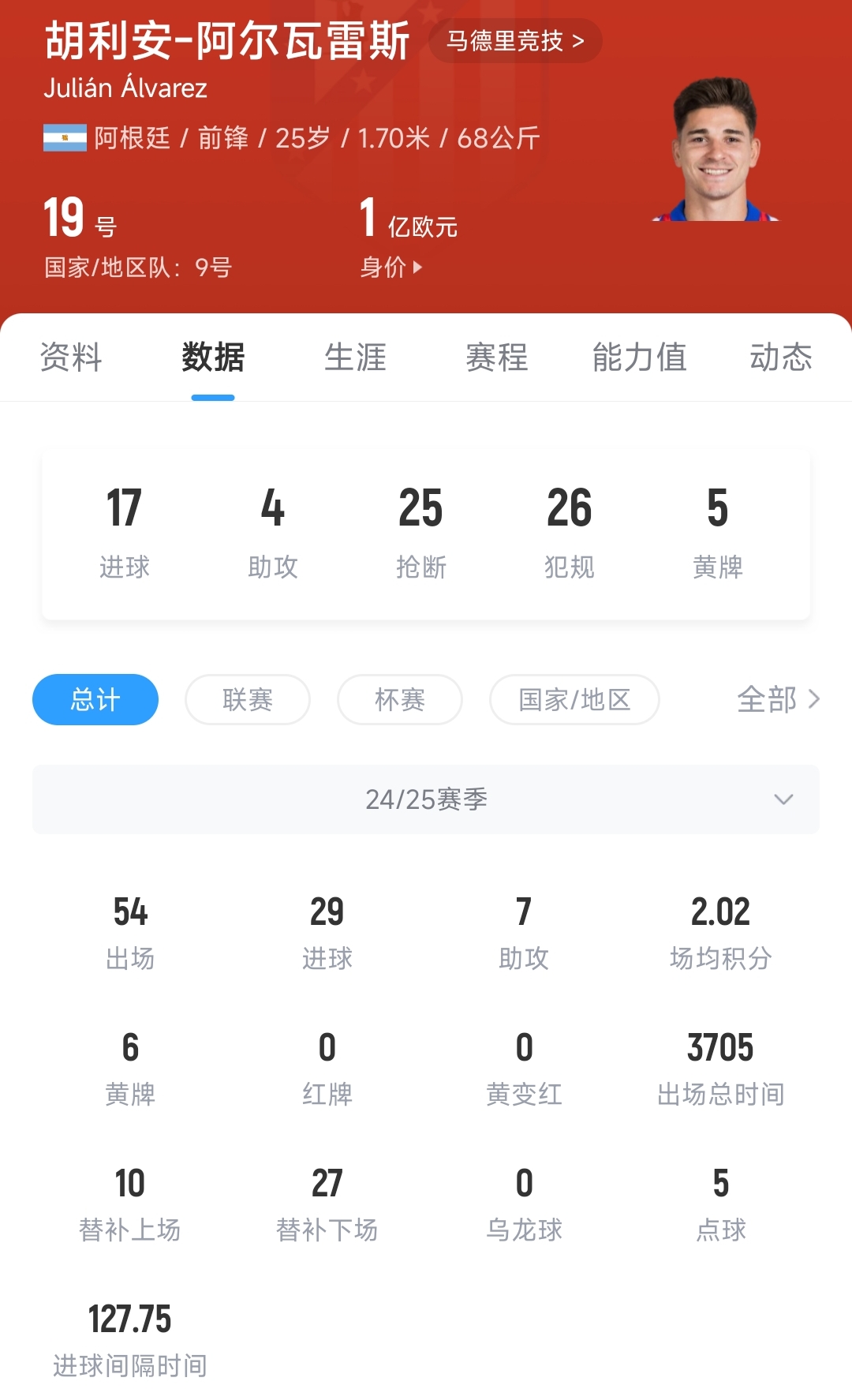 25歲的阿根廷前鋒阿爾瓦雷斯本賽季代表馬競出戰54場(chǎng)比賽,貢獻29粒進(jìn)球和7次助攻。2024年夏窗,阿爾瓦雷斯以7500萬(wàn)歐元的轉會(huì )費,從曼城加盟馬德里競技,簽約至2030年6月30日。
