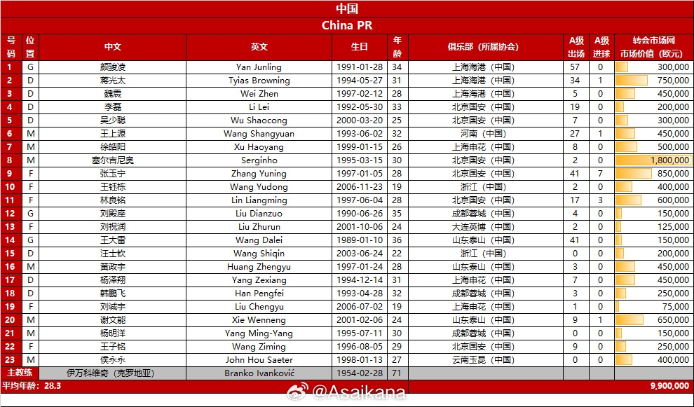 國足vs巴林23人大名單