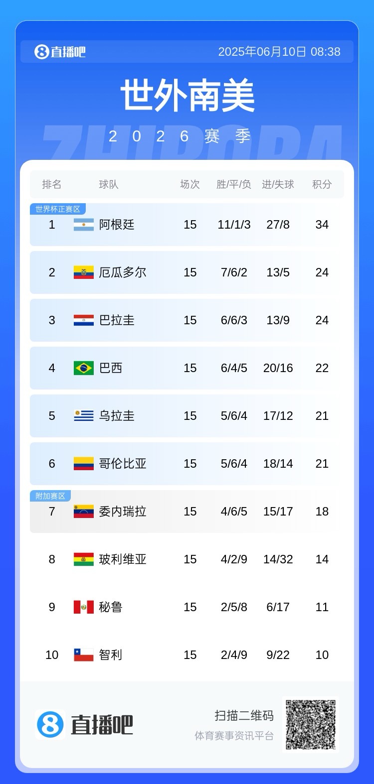 這種情況下巴西將積25分,與委內瑞拉的積分差距來(lái)到7分,巴西將拿到直通世界杯的名額。